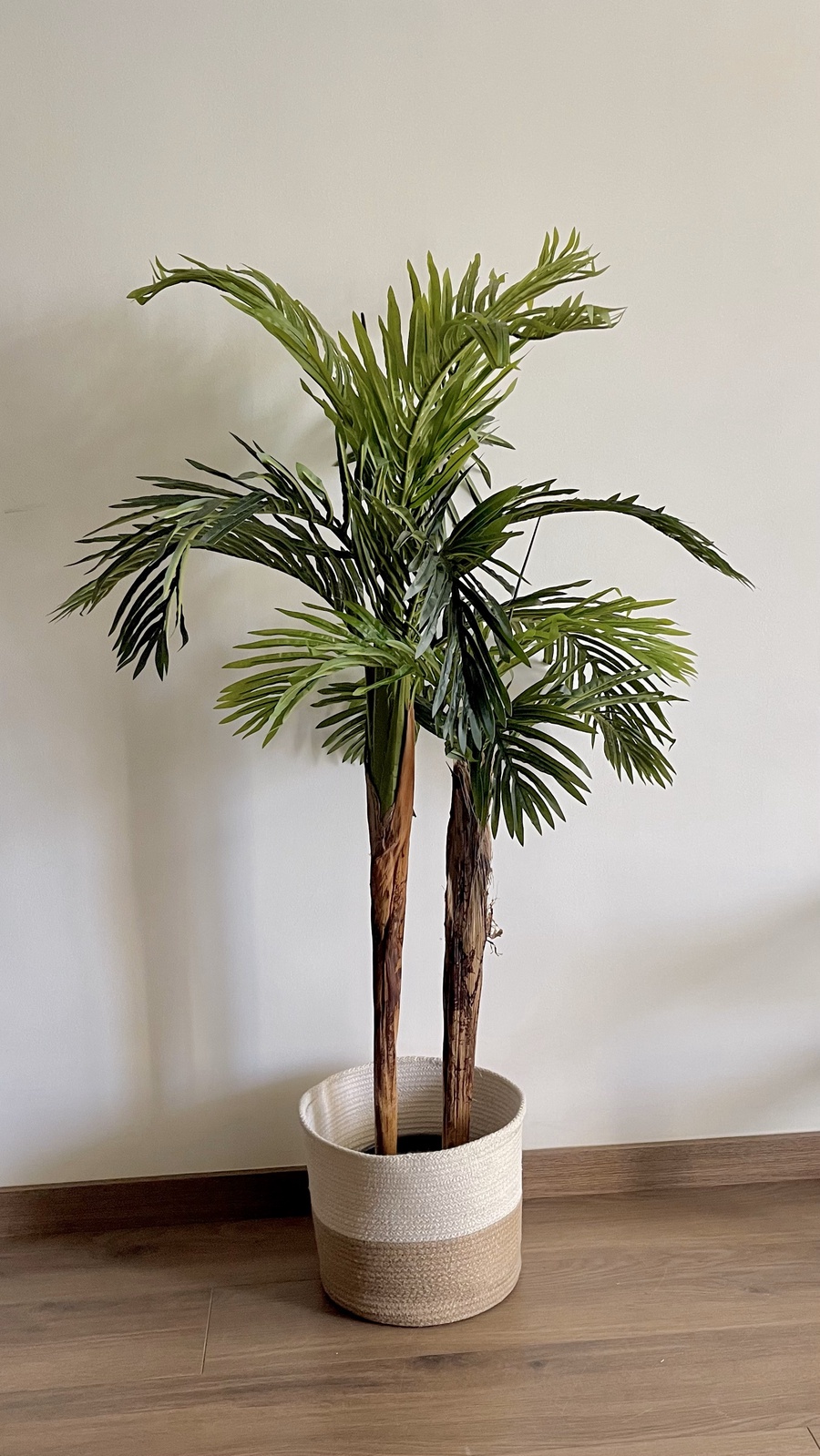 شجرة أريكا صناعية بارتفاع 135 سم، تحتوي على جذعين بتفاصيل خشبية واقعية وأوراق نخيلية خضراء ناعمة، تضيف لمسة من الطبيعة والفخامة إلى أي مساحة داخلية. متاحة الآن في مصر مع خدمة التوصيل.