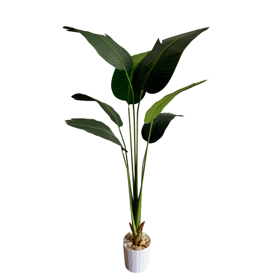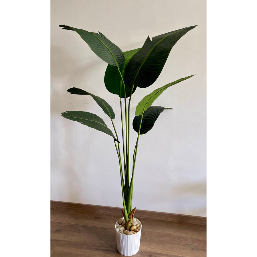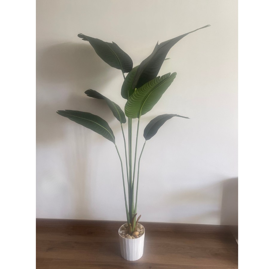 استمتع بأجواء استوائية فاخرة في منزلك أو مكتبك مع شجرة الموز الصناعية بخامة جينز وأوراق عريضة، بارتفاع 180 سم.