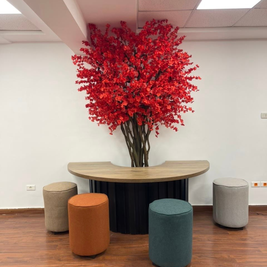 شجرة صناعية ذات طابع جمالي أنيق ومميز، بلون أحمر مشرق يلفت الأنظار. يتم تثبيتها على قاعدة أرضية وتوضع عادة في الزوايا أو خلف مكاتب الاستقبال لإضفاء إحساس بالحيوية والفخامة. الأوراق كثيفة وتفاصيلها دقيقة، مصنوعة من خامات عالية الجودة تحاكي الطبيعة. مناسبة للديكور الداخلي في الشركات، العيادات، الكافيهات، أو المنازل الواسعة.