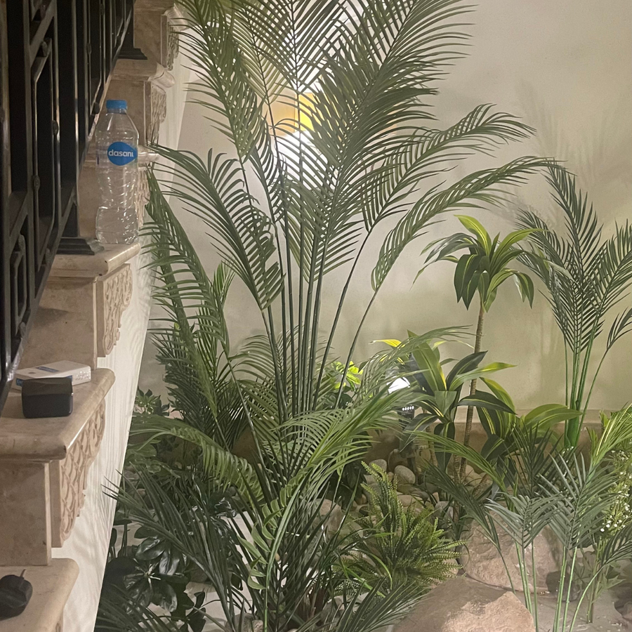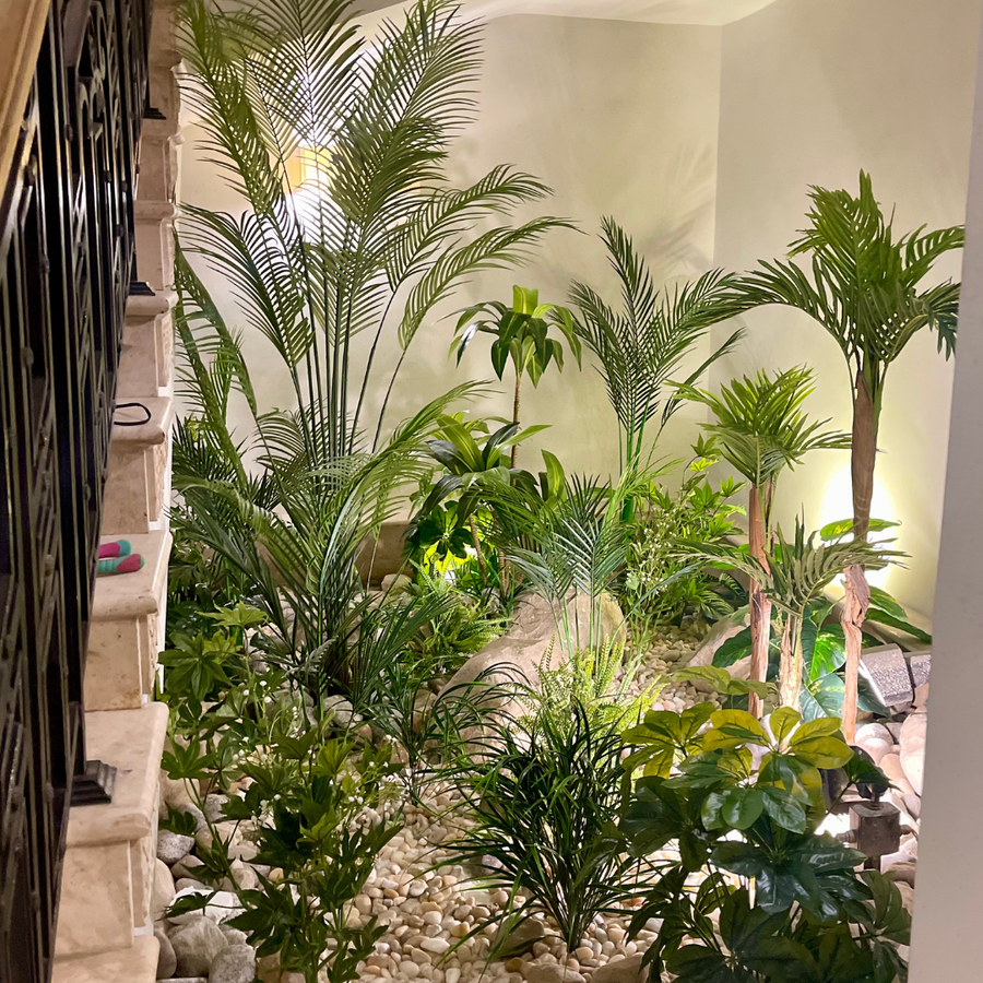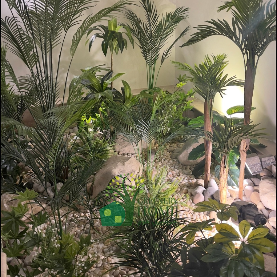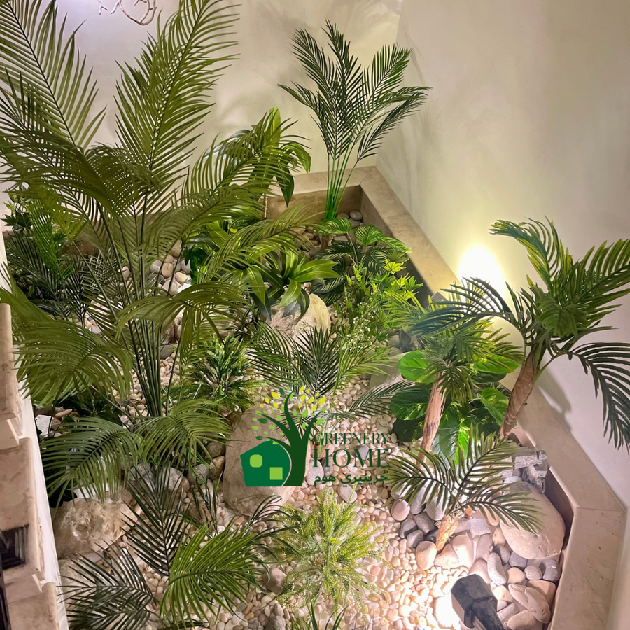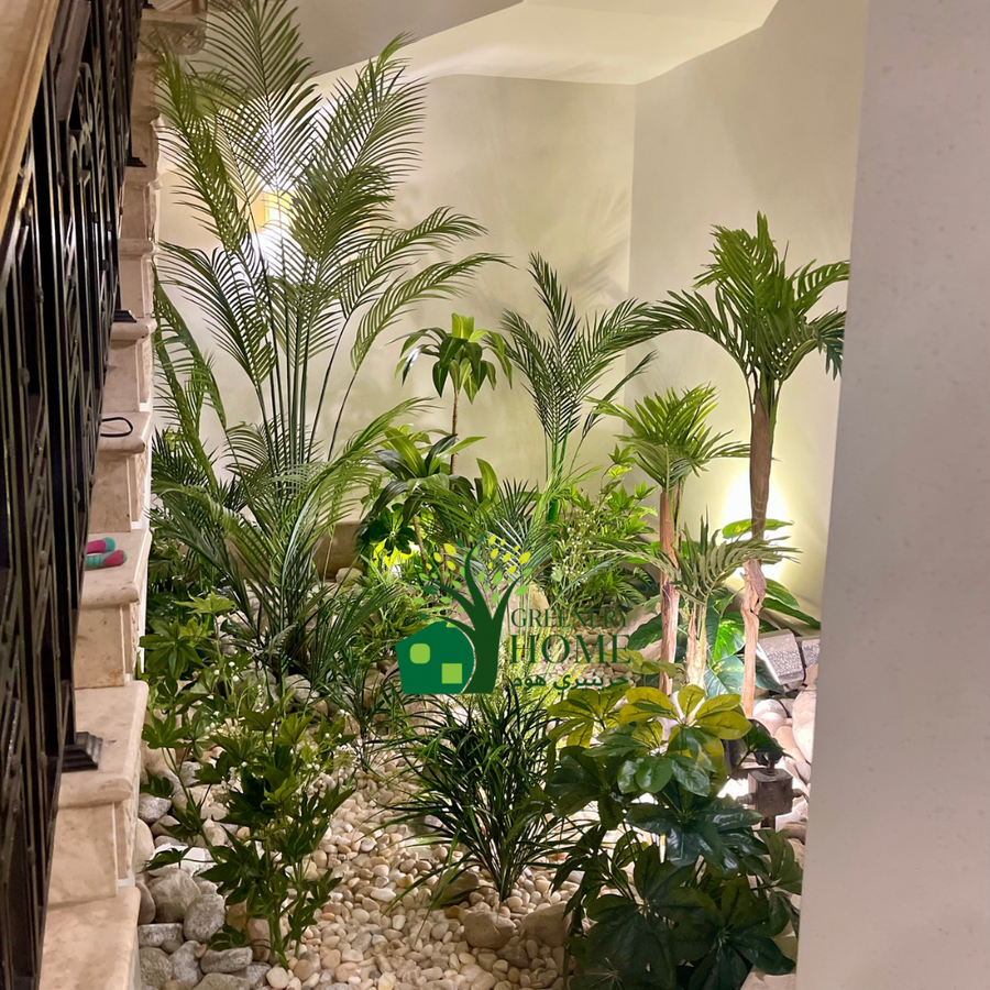 اخلق مشهدًا أخّاذًا في منزلك مع هذا التصميم المميز لحديقة صناعية تحت السلم، منسقة بعناية بأشكال وأحجام متنوعة من النباتات الصناعية عالية الجودة، لتحاكي الطبيعة بدقة وتمنح المكان لمسة من الحياة والجمال بدون أي صيانة.