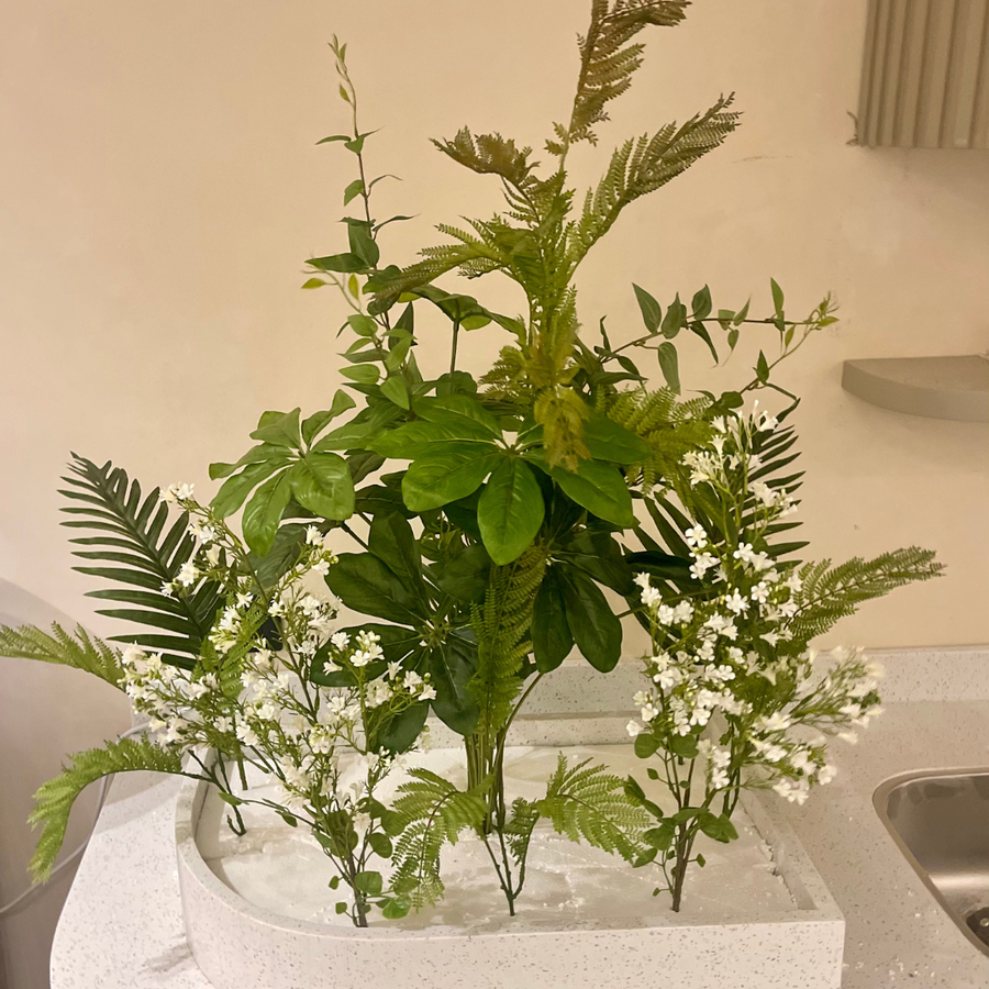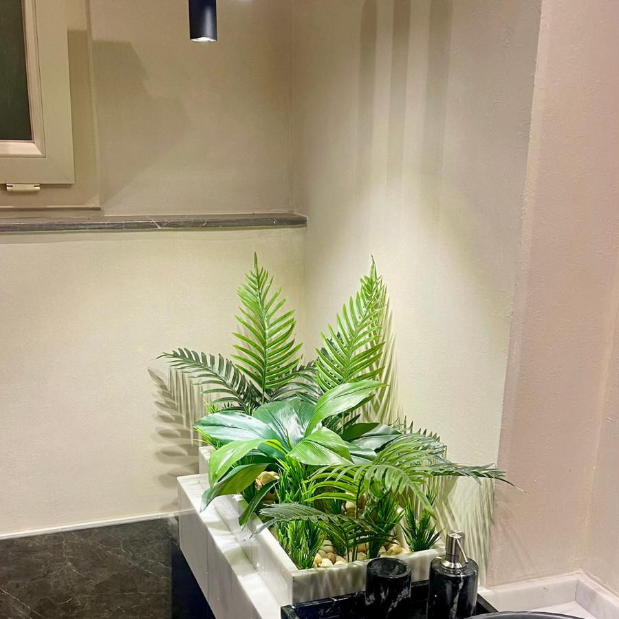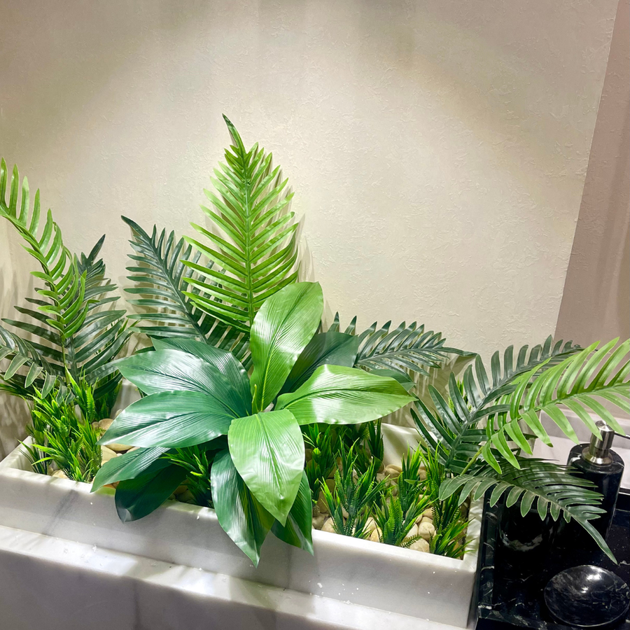 تم اختيار النباتات بأشكال وألوان متنوعة لإضفاء عمق وتناسق بصري مميز، في حوض رخامي أنيق يضفي فخامة على ديكور الحمام، طاولة جانبية، أو سطح المكتب.