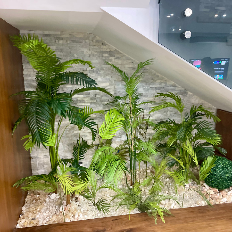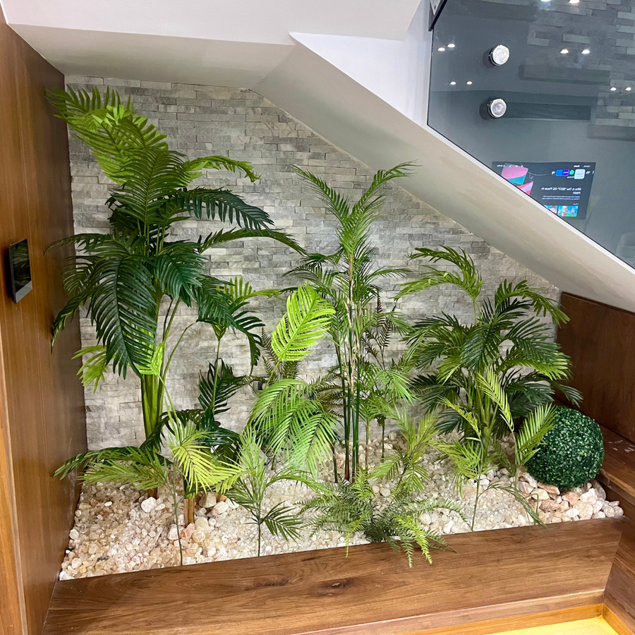 تم تنسيق هذا الحوض بأسلوب عصري ليُضفي عمقًا وأناقة إلى المساحات تحت السلالم، باستخدام مجموعة منتقاة من النباتات الاستوائية الصناعية التي توحي بالحياة الطبيعية دون أي حاجة للعناية أو الصيانة.