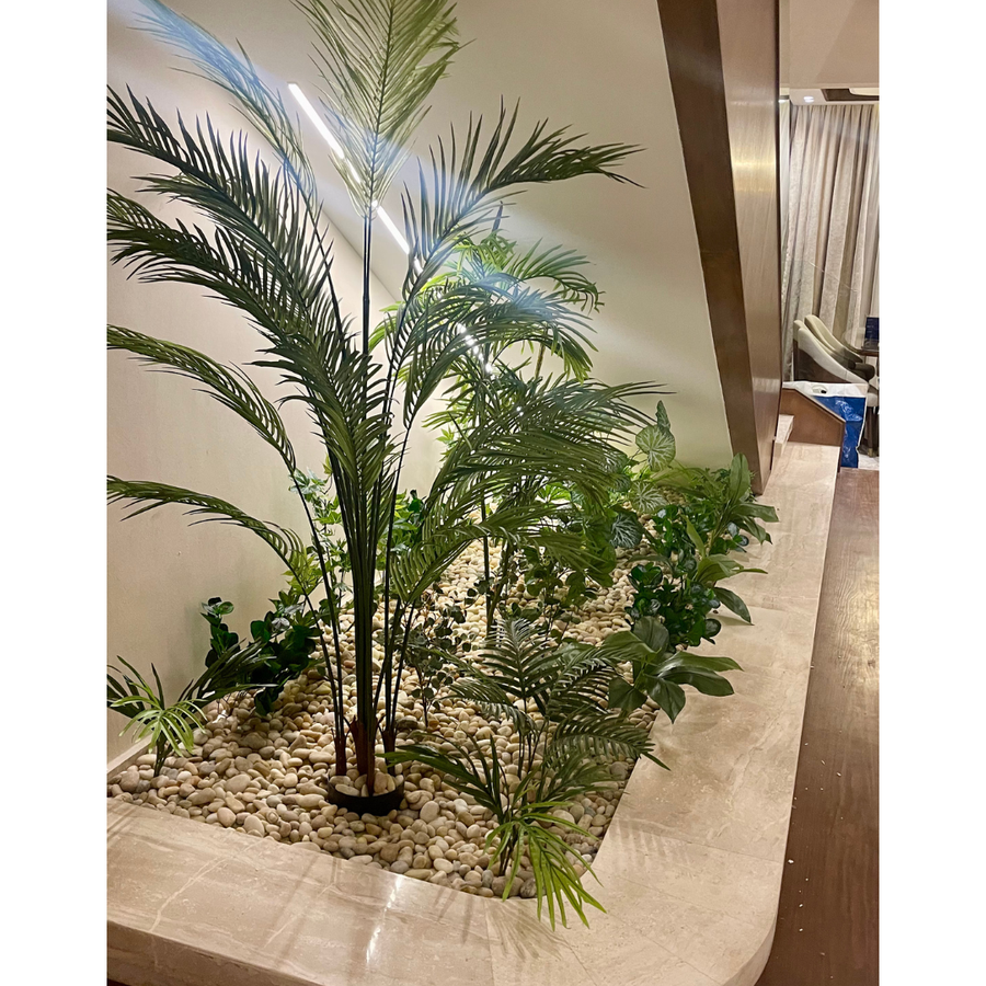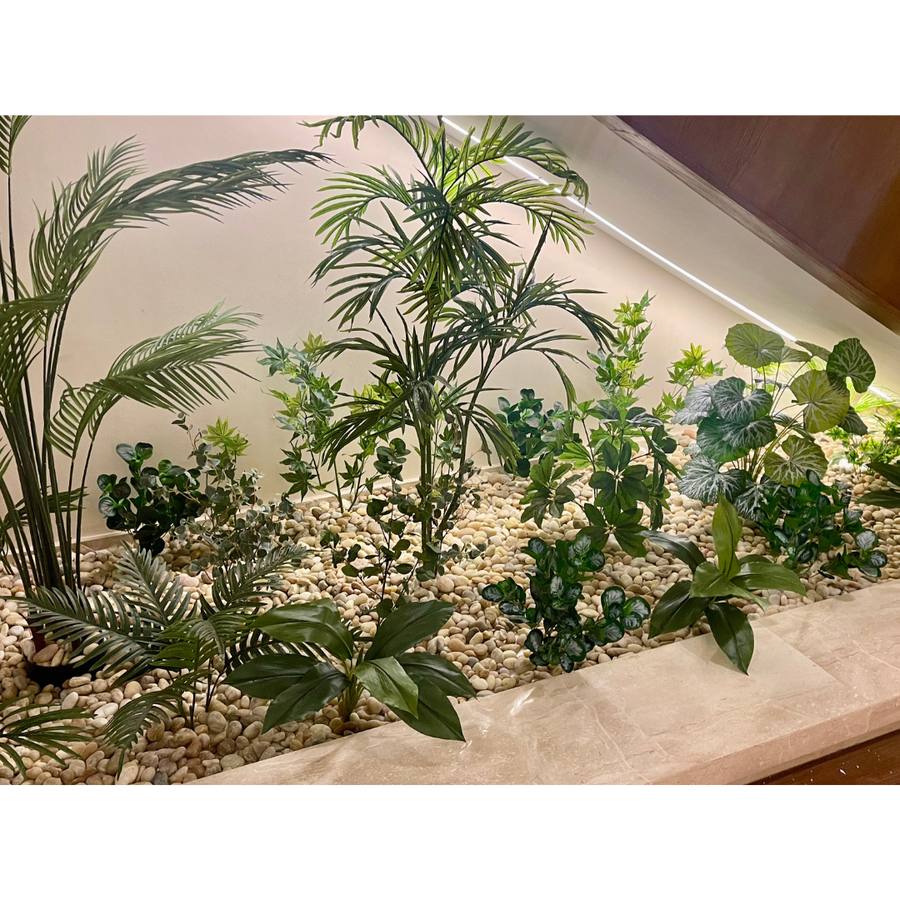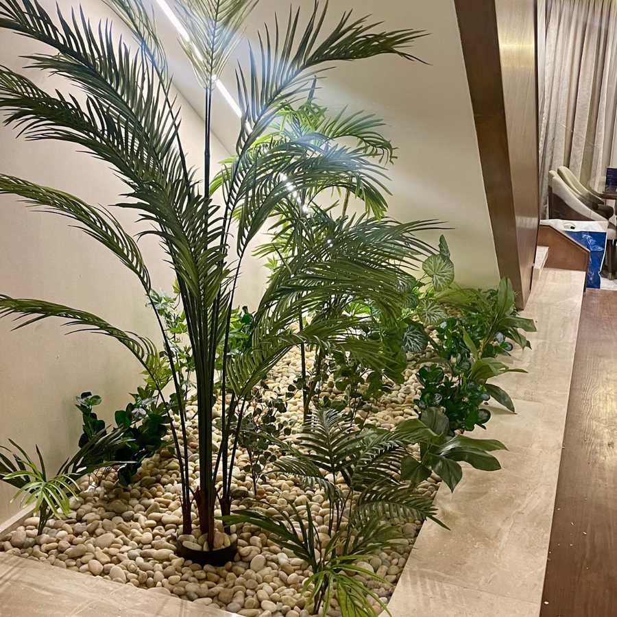 تم استخدام نخيل صناعي عالي الجودة إلى جانب أوراق متنوعة خضراء وحصى بيضاء ناعمة لإضفاء إحساس بالغنى والراحة في المكان.