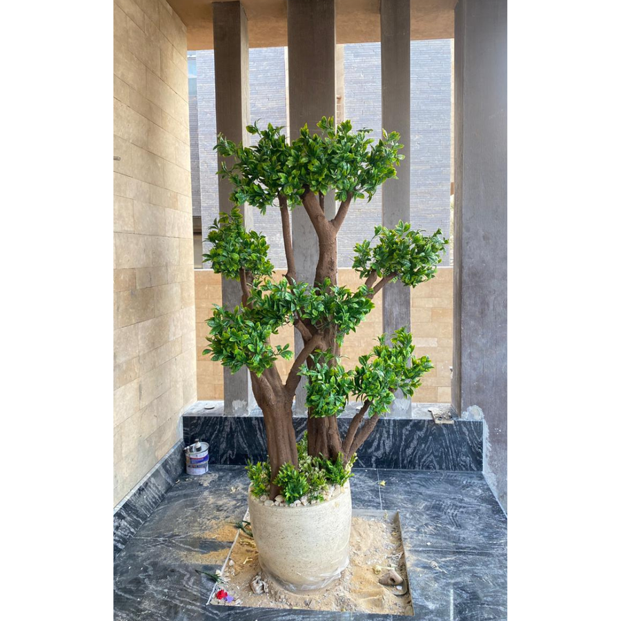 شجرة البونزاي الصناعية الديكورية ، تتميز بسيقان متعددة جذوع تشبه الأشجار الطبيعية، وتتفرع منها أوراق خضراء كثيفة تُضفي لمسة جمالية فاخرة. تم تثبيت الإناء في قاعدة من الرخام الأسود اللامع داخل مساحة مخصصة محفورة، مع خلفية من الأعمدة الخشبية الطولية والحائط الحجري البيج، مما يعطي تناغماً عصرياً وأنيقاً للمكان.