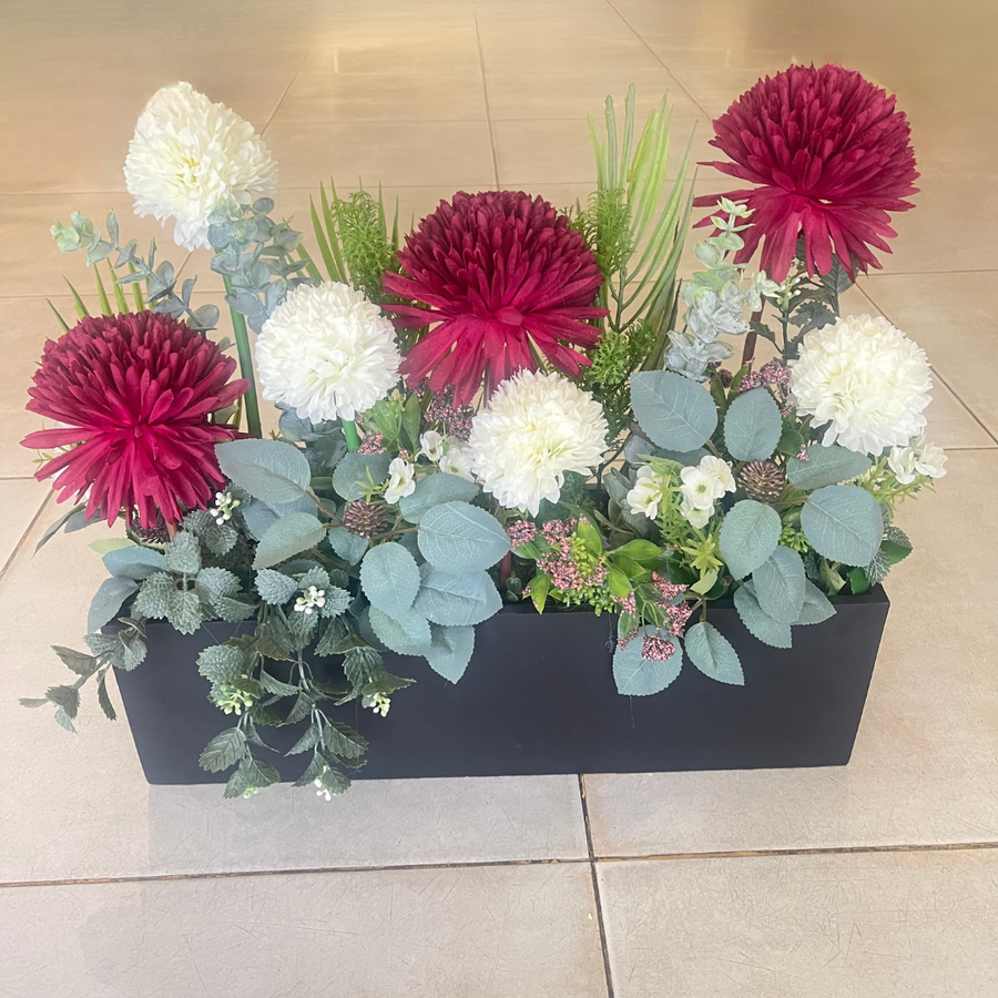 حوض خشبي بطول 50 سم يحتوي على تنسيق فاخر من الزهور الصناعية بلون عنابي داكن مع الأبيض الكريمي، مدعّم بأوراق خضراء وزهور صغيرة تضيف عمقاً وواقعية. التنسيق يوحي بالفخامة ويجذب الأنظار، مما يجعله اختيارًا مثاليًا لغرف الاستقبال، المداخل أو طاولات المناسبات.