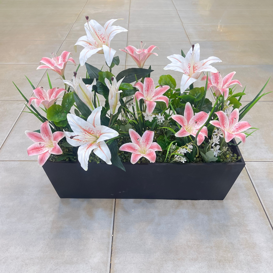 حوض خشبي بطول 50 سم يحتوي على باقة من زهور الليلي البيضاء والوردية بتنسيق متناسق يلفت النظر، تضيف لمسة من الحيوية والأناقة لأي مساحة داخلية. مصمم بعناية ليحاكي المظهر الطبيعي للزهور، ومناسب لتزيين غرف المعيشة أو صالات المناسبات أو المداخل.